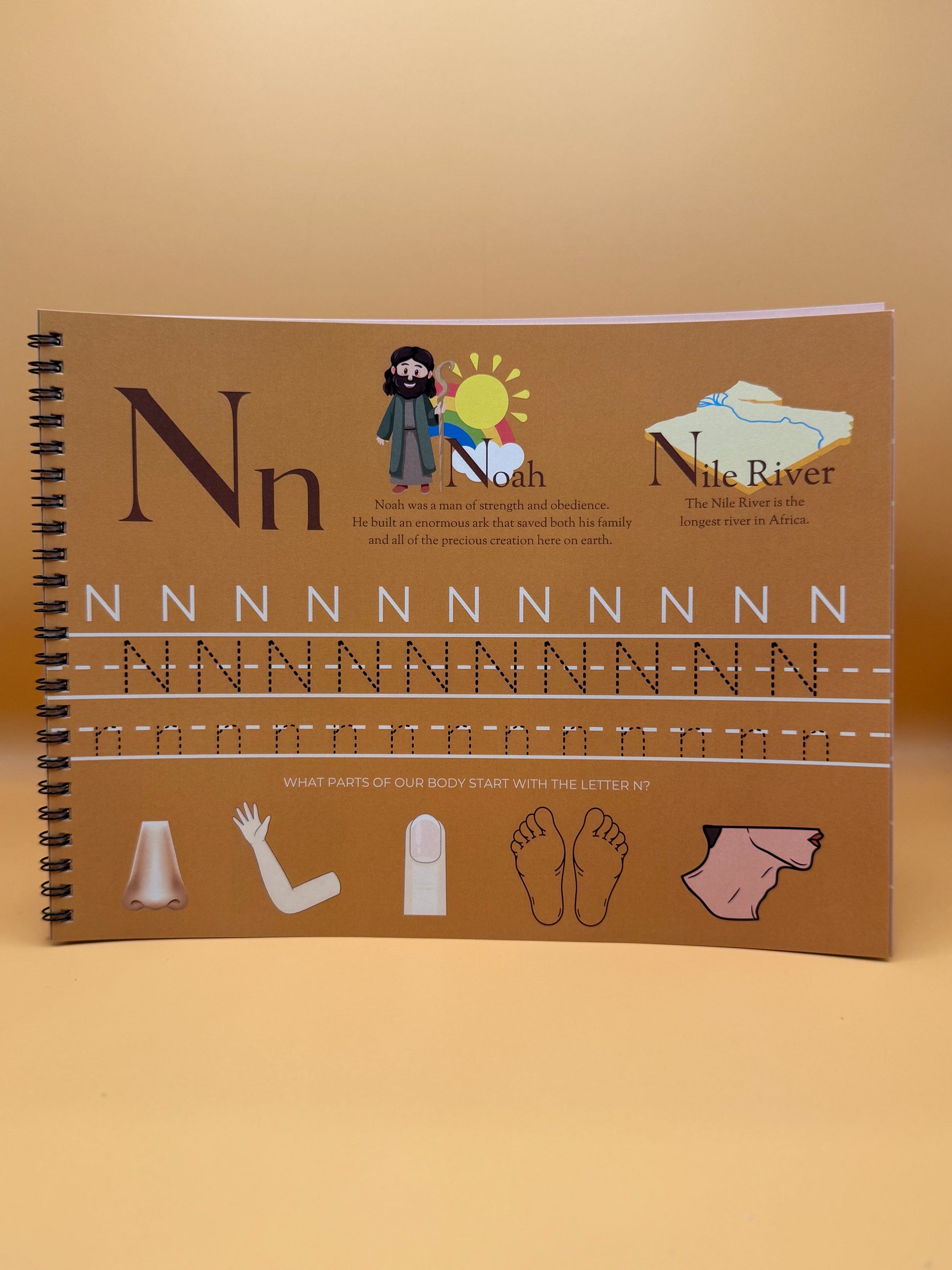 Your child's ADHD inspired handwriting book, which incorporates movement based learning and expanded vocabulary. Each letter tracing page highlights a bible character's name or word they might hear when the bible is read to them. i.e.: "Abel" & "Animal". The Movement portion of each page helps the child stay engaged after completing the written section. The end of the book includes extra tracing pages for each letter and a cut-out game they can play.